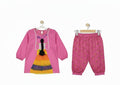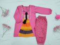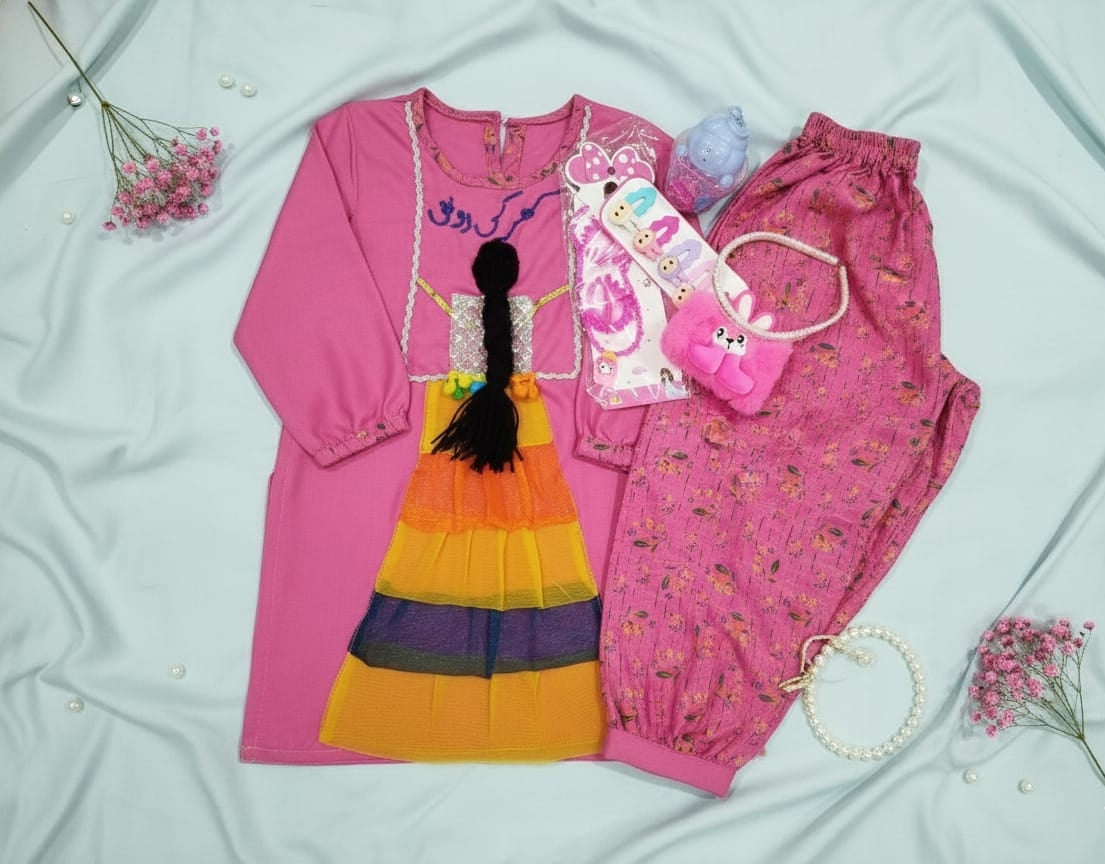 The dress features a handcrafted doll-inspired design with colorful layered frills, a braided embellishment, and detailed “Ghar Ki Ronak” embroidery that adds a beautiful, homely touch to the outfit. Paired perfectly with printed khaddar trousers, it offers a stylish yet cozy winter look for your little one.
