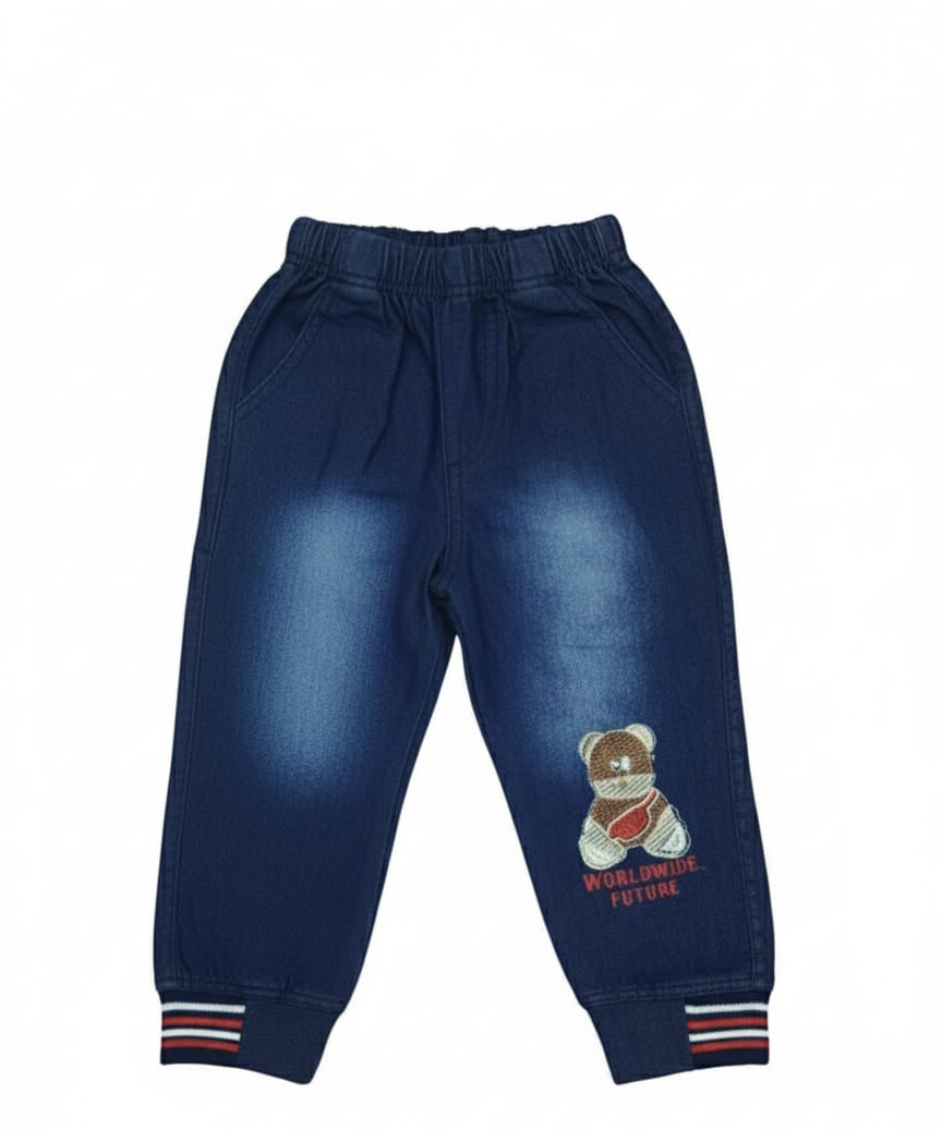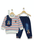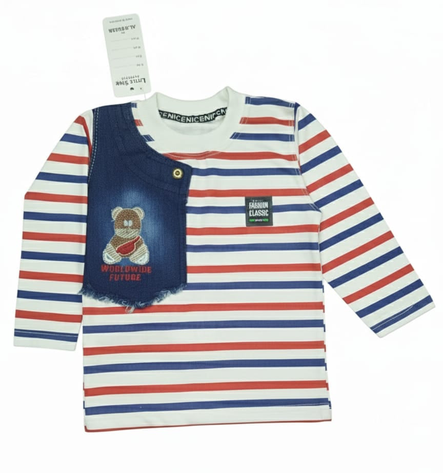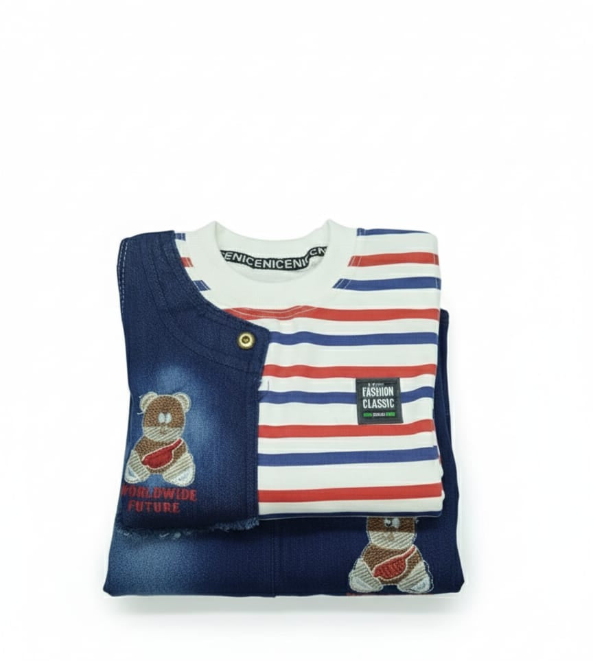 Featuring a red and blue striped full-sleeve shirt with a cute teddy patch and stylish denim jogger pants, this set blends comfort with fashion. The soft, breathable fabric ensures all-day comfort, while the denim accents add a cool, modern look.